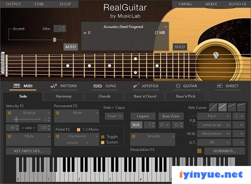 2. 独特的浮动品格位置技术,模拟吉他手弹奏品格位置的变化,只需使用标准键盘的 43 个键,即可在吉他的 104 品上弹奏!